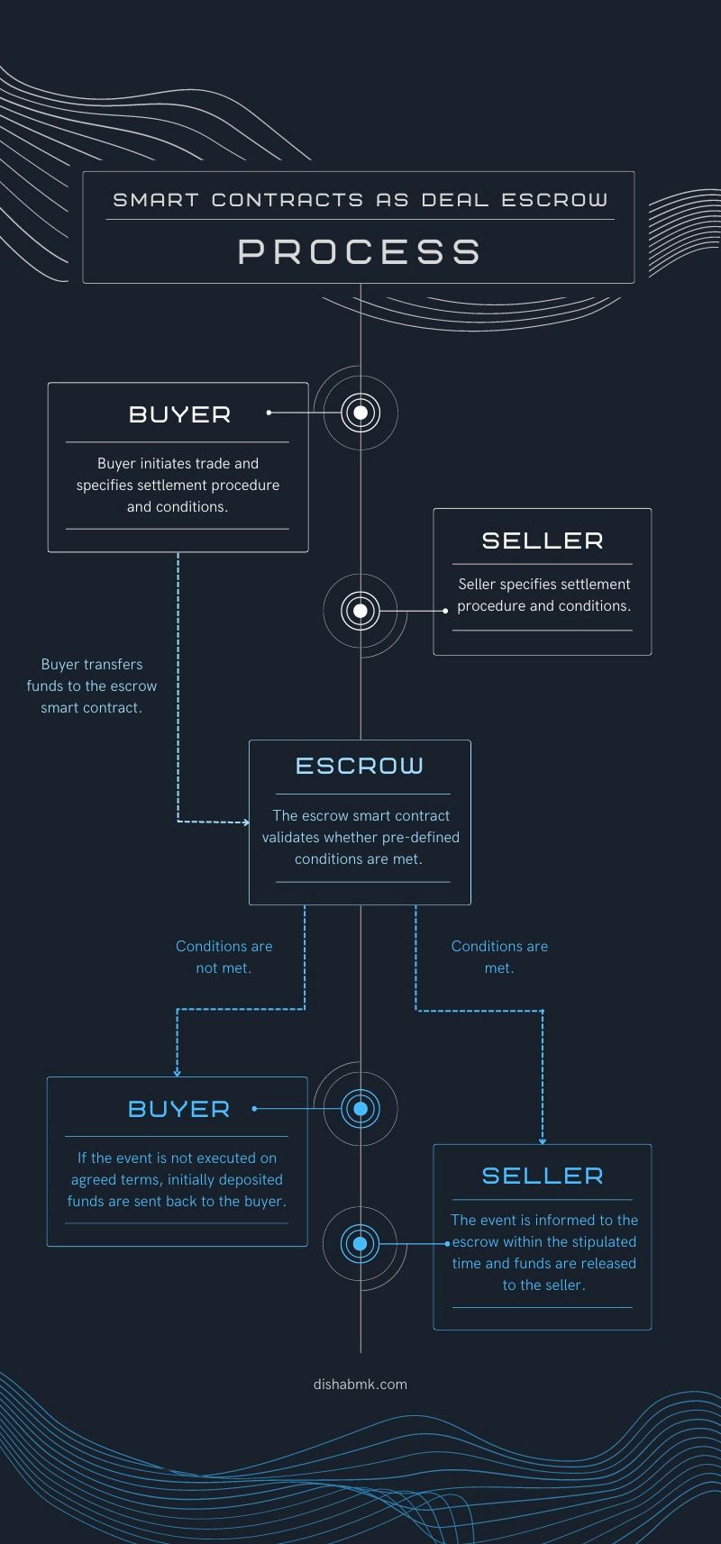 Smart contract process. (1) The buyer and seller specifies payment conditions as they would in any trade. (2) Funds are sent as collateral to the escrow smart contract. (3) The escrow, powered by blockchain, automatically validates whether the stated conditions are met at the time the deal is scheduled for. (4) Say, for instance, that the buyer was not able to deliver funds on their end. Simple "if/when" lines of code would notify the seller that the settlement requirements haven't been met. (5) Funds are automatically returned to the seller and the deal is canceled.
