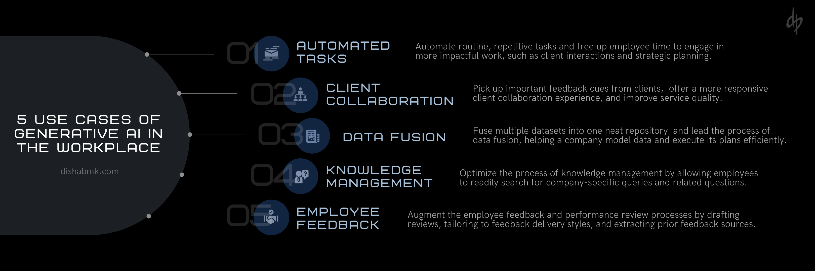 At a larger scale, generative AI has the potential to optimize company operations and fuel economic growth. For the employee, the integration of generative AI introduces a plethora of beneficial use cases, including automated tasks, client collaboration, data fusion, knowledge management applications, and personalized employee feedback and training.